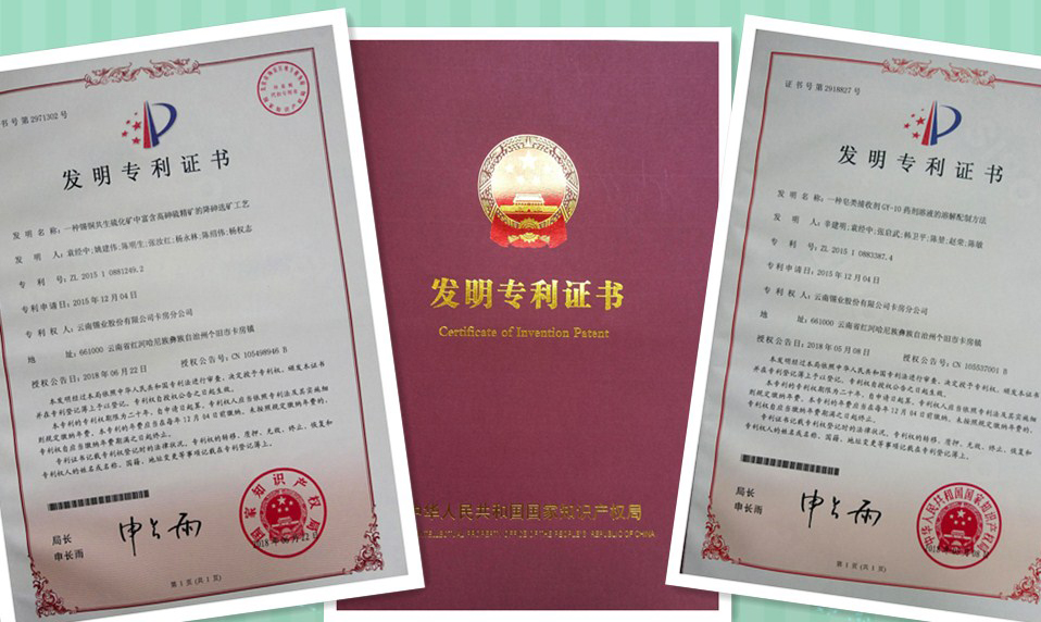 近日,卡房分公司申報的發(fā)明專利《一種共生硫化礦中富含高砷硫精礦的降砷選礦工藝》《一種皂類捕收劑GY-10藥劑溶液的溶解配制方法》獲得國家知識產權局正式授權,并被授予國家發(fā)明專利證書。