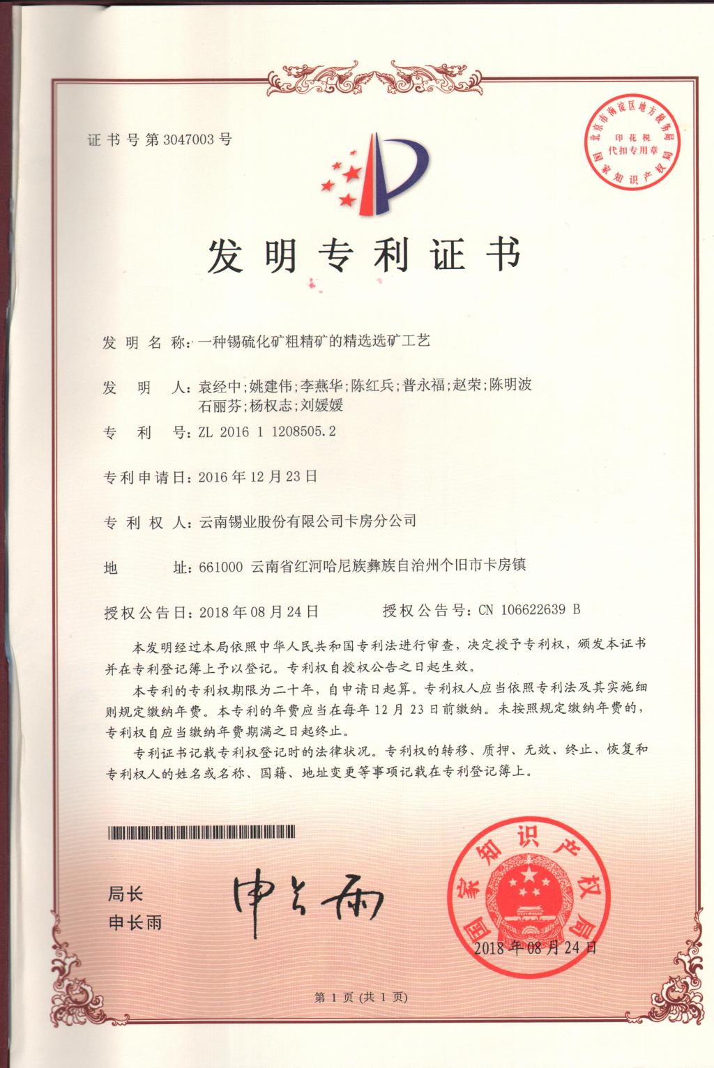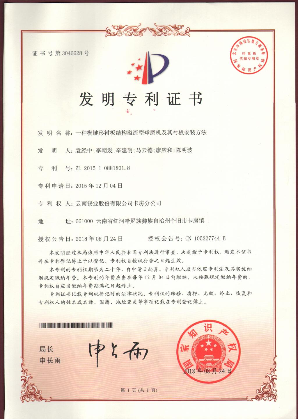 近日,卡房分公司申報的發(fā)明專利《一種楔鍵形襯板結(jié)構(gòu)溢流型球磨機及其襯板安裝方法》《一種錫硫化礦粗精礦的精選選礦工藝》再獲國家知識產(chǎn)權(quán)局正式授權(quán),并授予國家發(fā)明專利證書。這是今年繼8月份該分公司申報的發(fā)明專利《一種共生硫化礦中富含高砷硫精礦的降砷選礦工藝》《一種皂類捕收劑GY-10藥劑溶液的溶解配制方法》獲國家發(fā)明專利證書之后,再獲兩項發(fā)明專利授權(quán)。