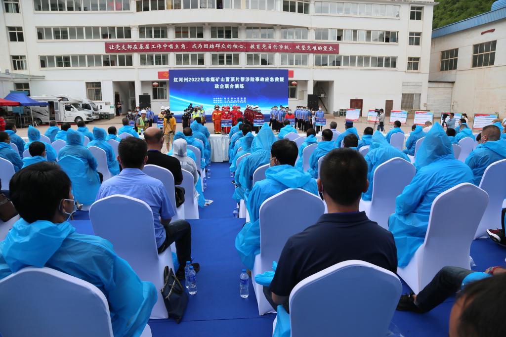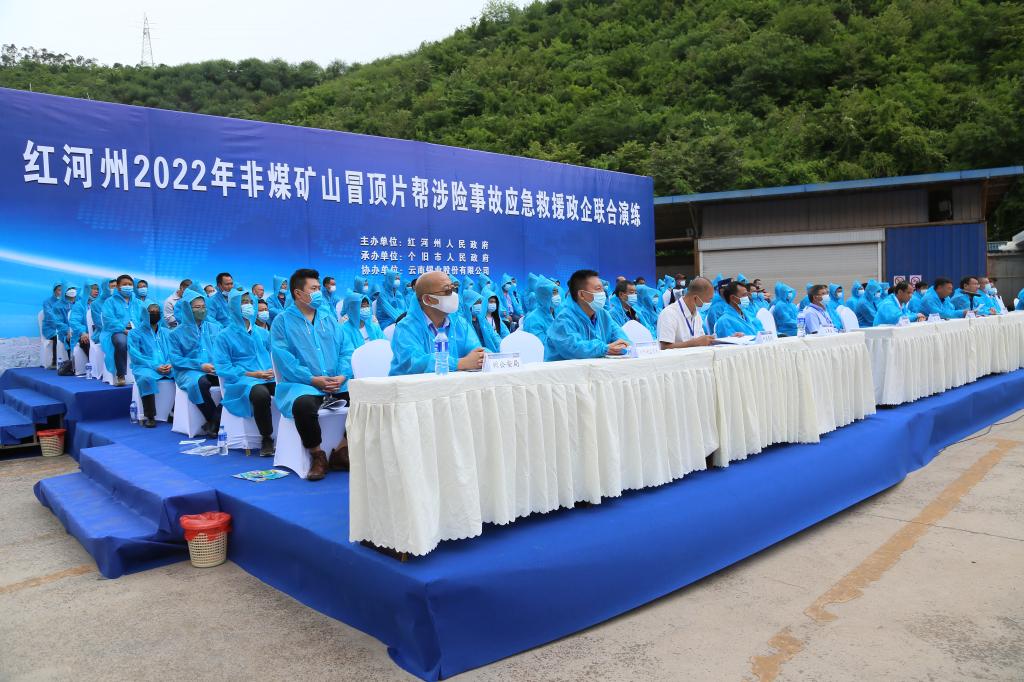 6月23日,由紅河州人民政府主辦、個舊市人民政府承辦、云南錫業(yè)股份有限公司協(xié)辦的紅河州2022年非煤礦山冒頂片幫涉險事故應急救援政企聯(lián)合演練在大屯錫礦舉行。認真學習貫徹落實習近平總書記關于安全生產重要論述,推動各級應急管理責任落實,壓實安全生產責任,切實提高紅河州非煤礦山事故應急救援能力。紅河州人民政府副秘書長楊克平,紅河州應急管理局局長張錳,錫業(yè)股份黨委副書記、董事長、總經理劉路坷,錫業(yè)股份黨委委員、副總經理王建偉,錫業(yè)股份黨委委員、大屯錫礦黨委書記、經理王壽安等出席演練活動。