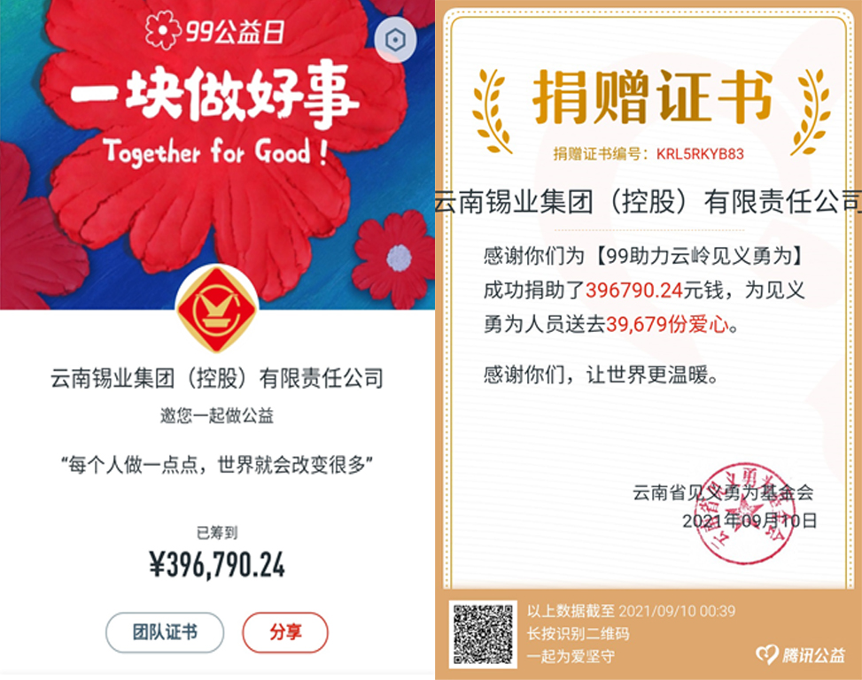 云錫控股公司積極響應(yīng)云南省見義勇為基金會(huì)號(hào)召,連日來大力開展“99公益日·助力云嶺見義勇為”宣傳募捐活動(dòng),共同唱響新時(shí)代的英雄贊歌。截止9月9日24時(shí),云錫共有13277人次通過手機(jī)微信掃碼的方式參與網(wǎng)絡(luò)募捐活動(dòng),累計(jì)捐款396790.24元。