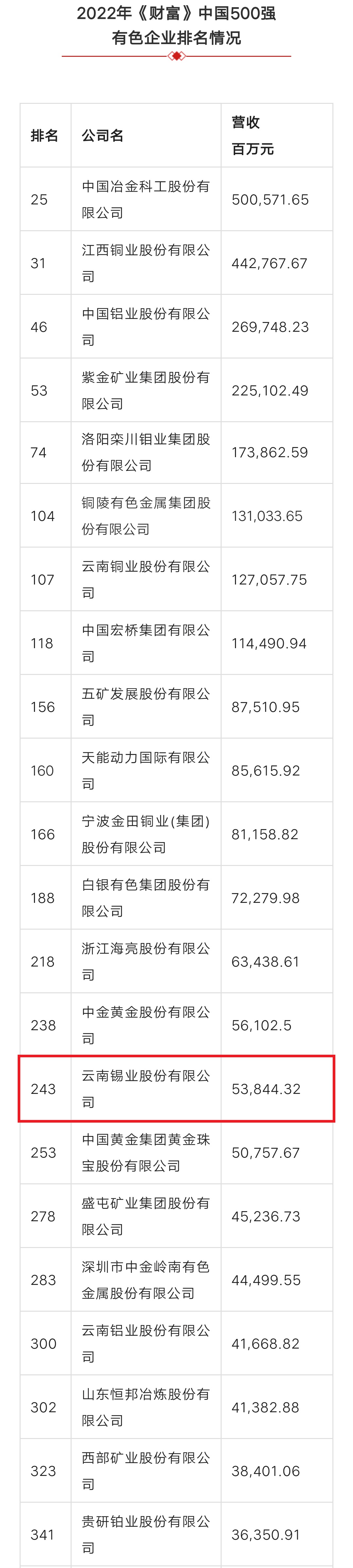 近日,2022年《財富》中國500強排行榜揭曉。今年500家上榜的中國上市公司總營業(yè)收入達(dá)到62萬億元人民幣,和上年上榜公司相比,增長約17.4%;凈利潤達(dá)到了4.7萬億元,較上年增長約9.2%。云南錫業(yè)股份有限公司以營收538.44億元的業(yè)績,排名第243位,發(fā)展實力和企業(yè)競爭力再獲認(rèn)可。